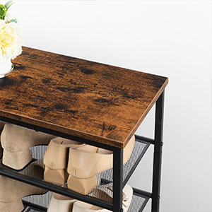 Durable and Secure: Crafted from high-quality particleboard and a sturdy metal frame, this shoe rack is built to last. The wooden top supports up to 22 pounds, with each metal mesh shelf holding up to 11 pounds.