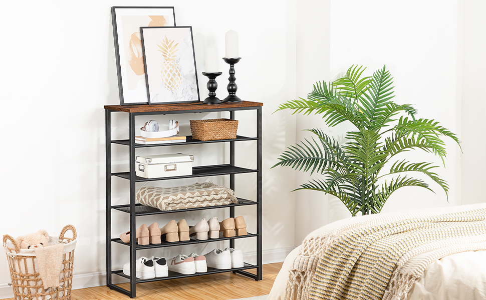 Stylish and Practical: This original shoe organizer combines elegance with functionality. Its matte black frame and rustic brown finish match perfectly with your furniture.